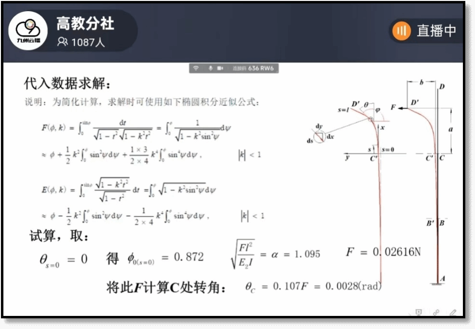 随后,江晓禹教授为大家讲解了提高题的出题思路和解决方法。江教授指出,提高题出题的思路依然是从材料力学基本知识出发,但与基础题不同的是,可适当超出正常的教学大纲要求,须具有选拔作用。因此,本次竞赛的提高题以梁的变形问题为考点,考察学生对大、小变形的判断方法以及大变形近似计算方法。题目从形式上看较为简单,但需要学生掌握扎实的力学基础和数学计算能力。